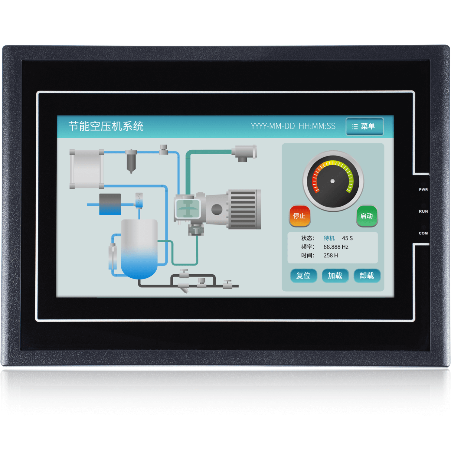 金璽HMI在變頻器的應(yīng)用,采用MODBUS協(xié)議與變頻器通訊,對變頻器進行啟停控制,對變頻器的電流,頻率,功率等進行監(jiān)控。